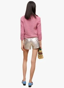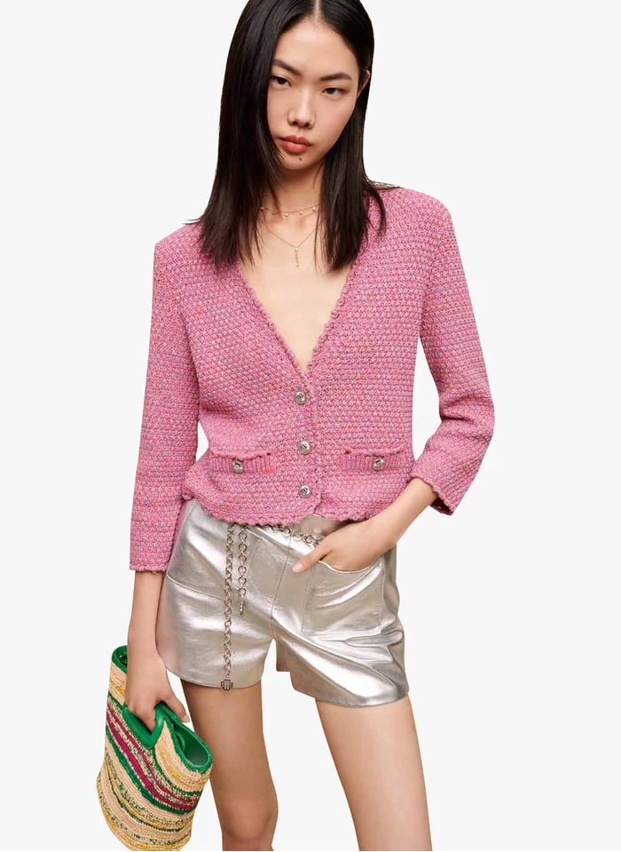 - Ce gilet en maille effet tweed se joue en total look avec le top et la jupe assortis, ou s’accompagne simplement de denim pour une allure plus casual. Muni de boutons travaillés et d’une encolure plongeante, et il dévoile des manches trois-quarts.